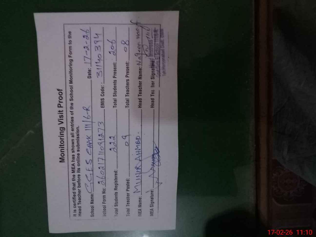 | Attendance Register | Head Teacher | MEA with School | Visit Proof |