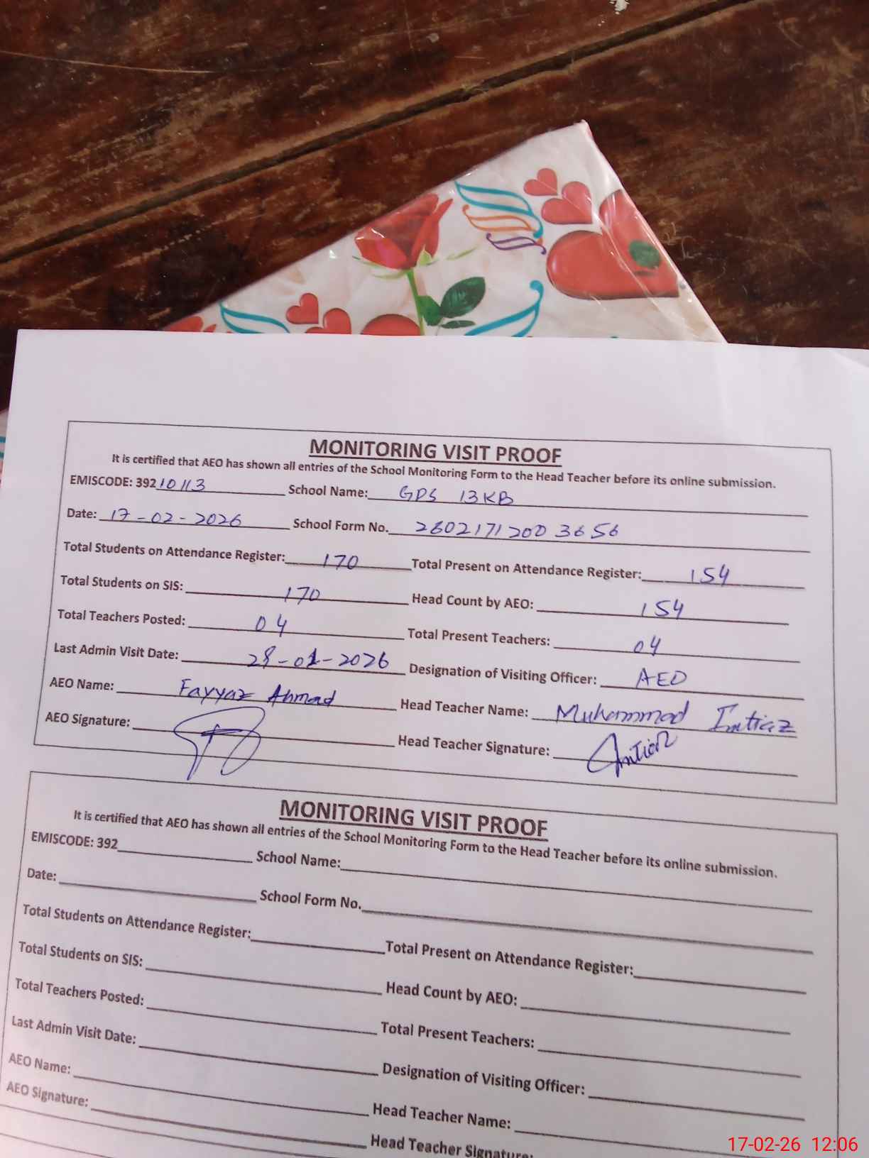 | Certified that this School was Inspected by the Undersigned MEA/DMO Today and the Information Stated Above is as Per Record. | |||||