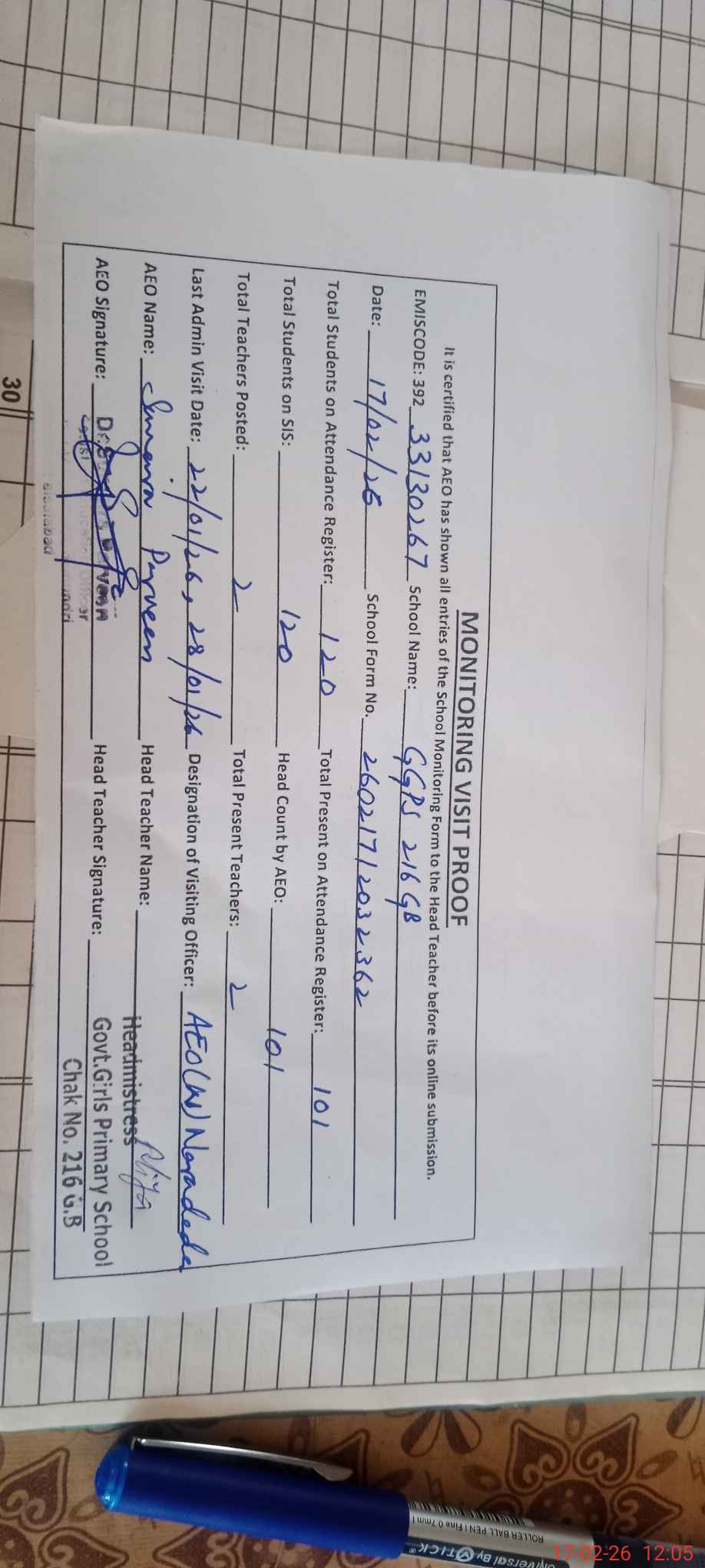 | EMIS Code: 33130267 | Name of School: GGPS CHAK 216 GB I MAMUNKANJAN | |||