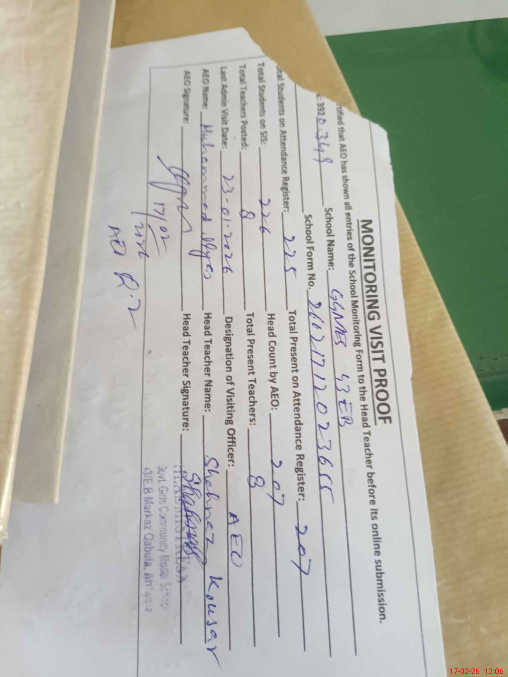 | Attendance Register | Head Teacher | MEA with School | Visit Proof |