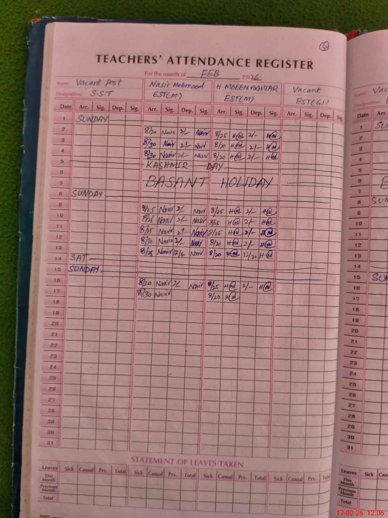 | CNIC | Full Name | Designation | R/C | Absence During Last Calender Month |