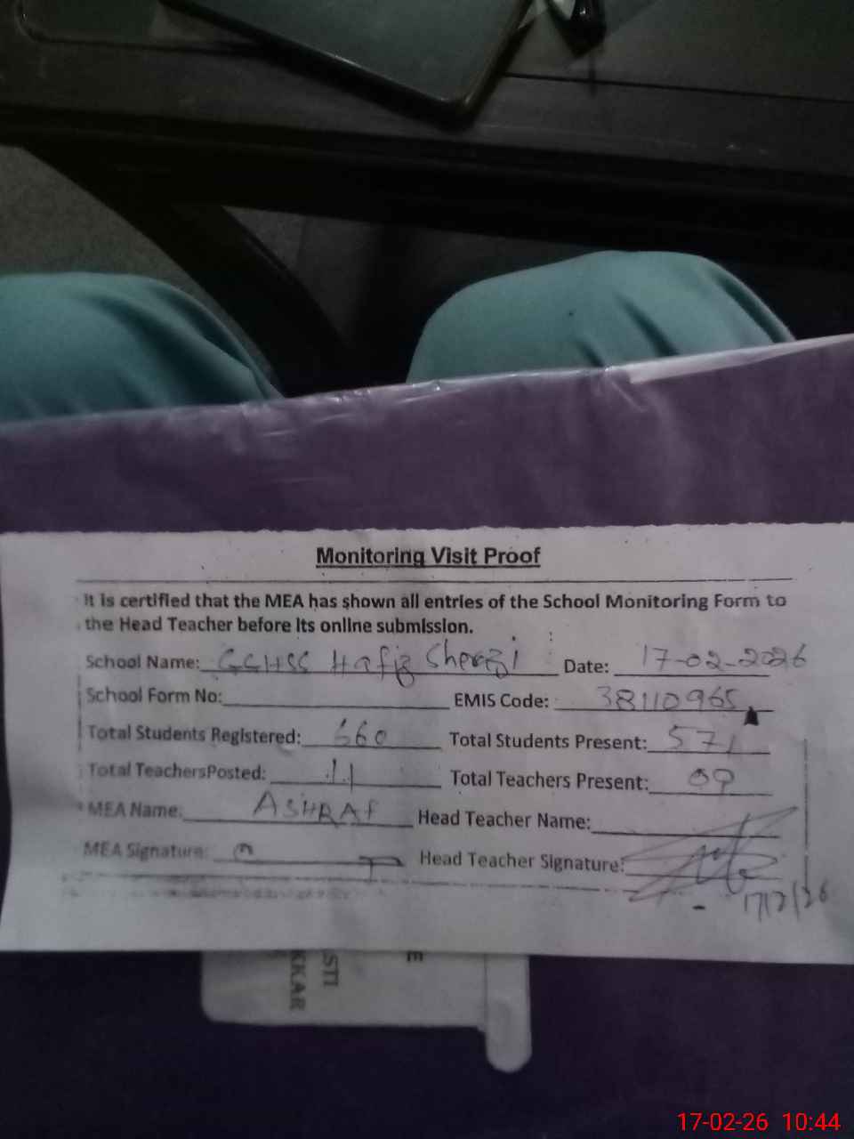 | Attendance Register | Head Teacher | MEA with School | Visit Proof |