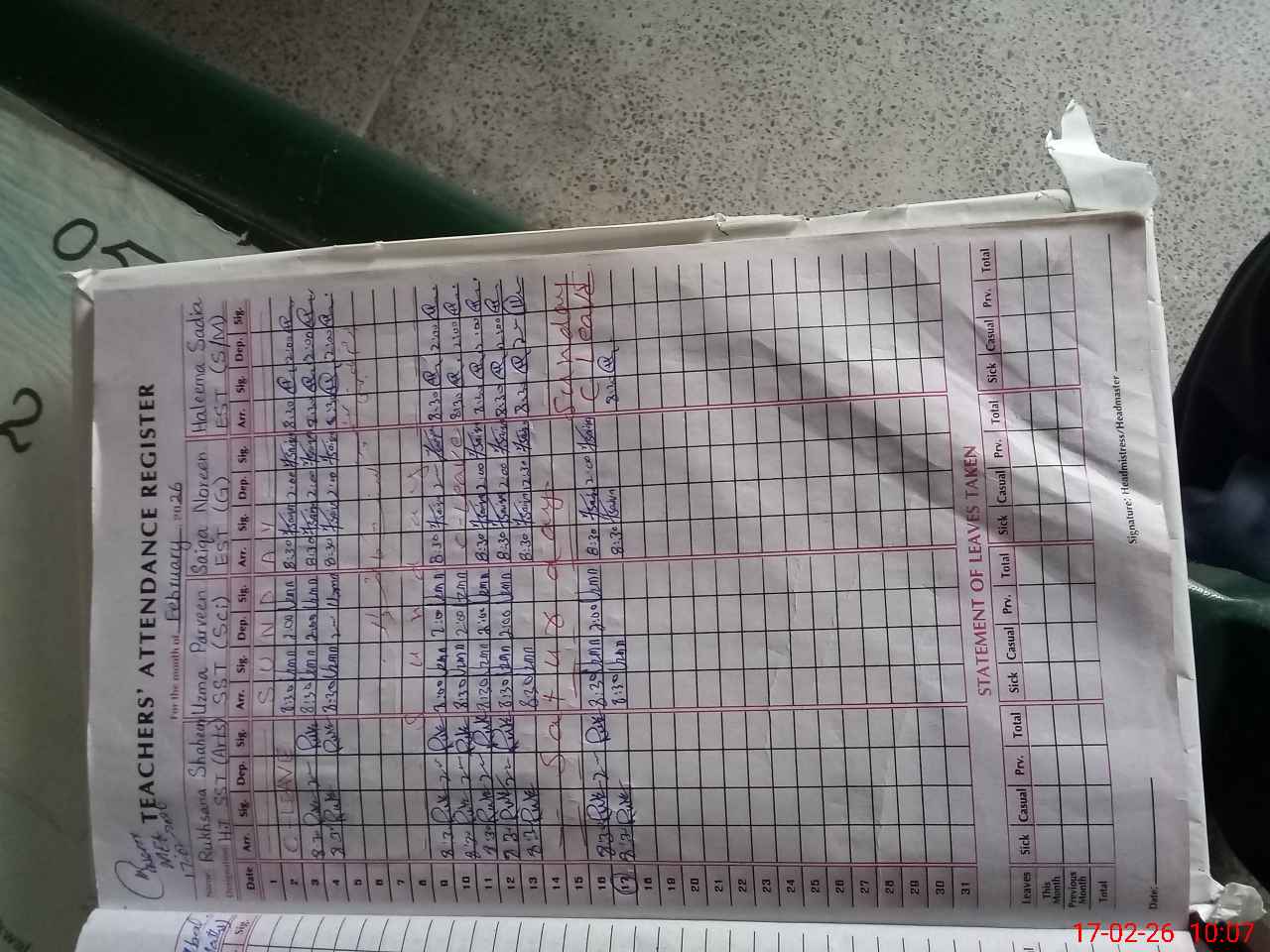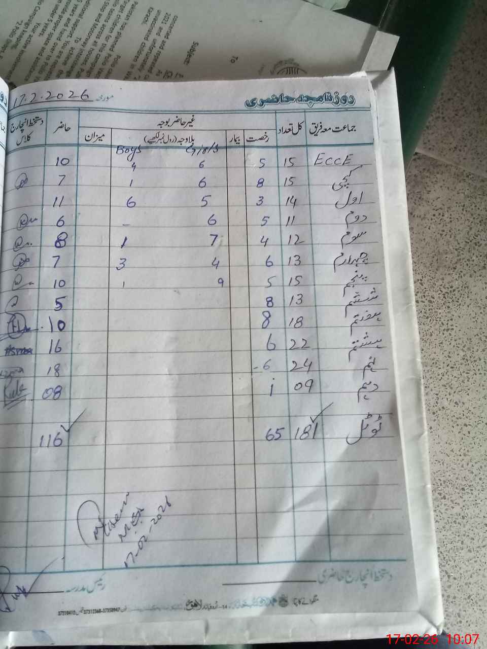 | Remarks (Use Separate Page if Required): On physical counting of students difference of 3 students found rest all ok Est Hifza Iqbal found absent since October 2025 | |||||
