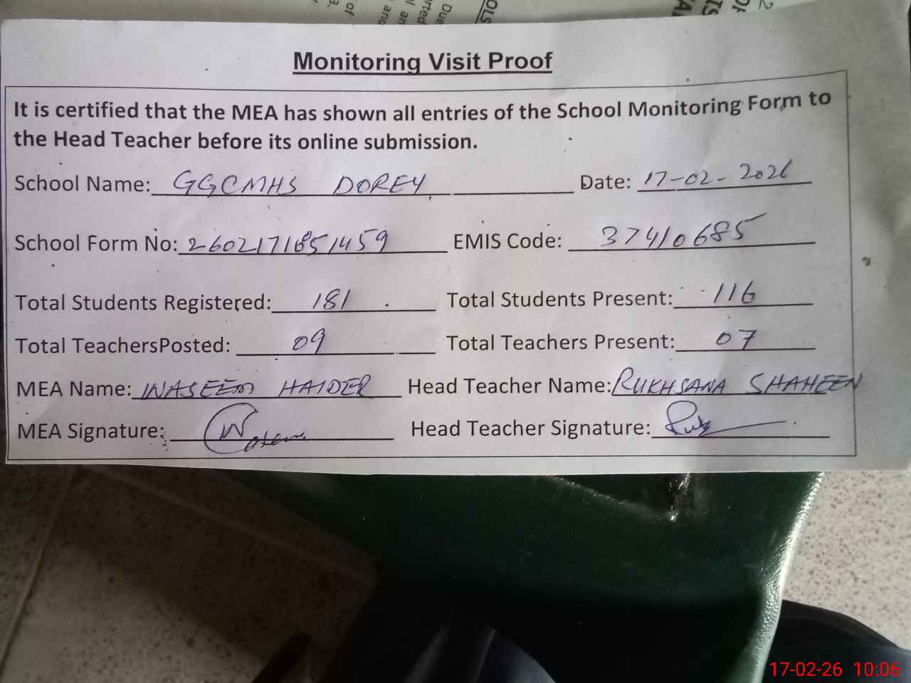 | Certified that this School was Inspected by the Undersigned MEA/DMO Today and the Information Stated Above is as Per Record. | |||||