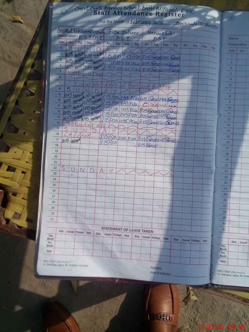 | Monitoring Date: 17-02-2026 | Start Time: 17-02-2026 08:47 AM | End Time: 17-02-2026 09:22 AM | Name of MEA: Mu**** Aj**** | |