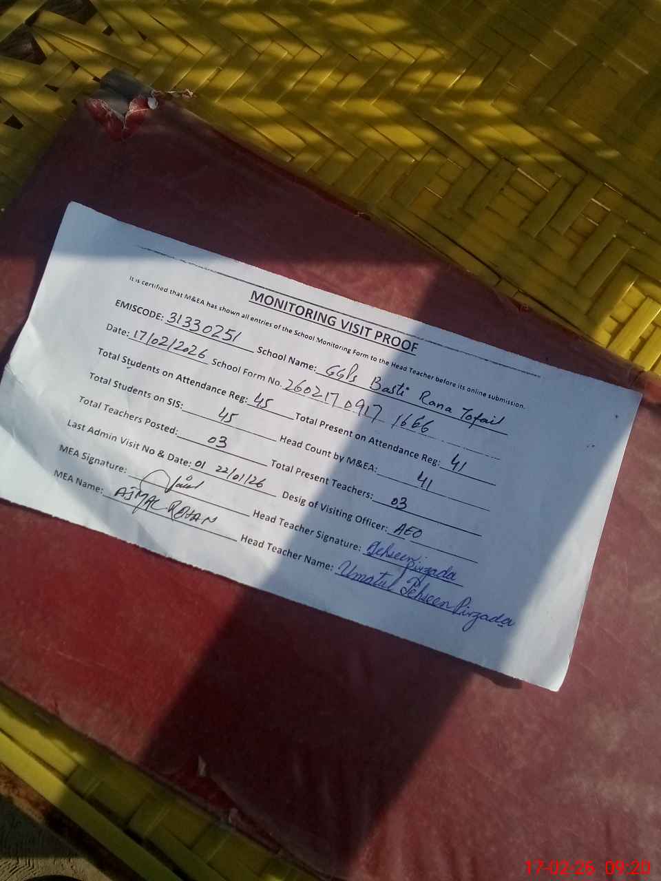 | Attendance Register | Head Teacher | MEA with School | Visit Proof |