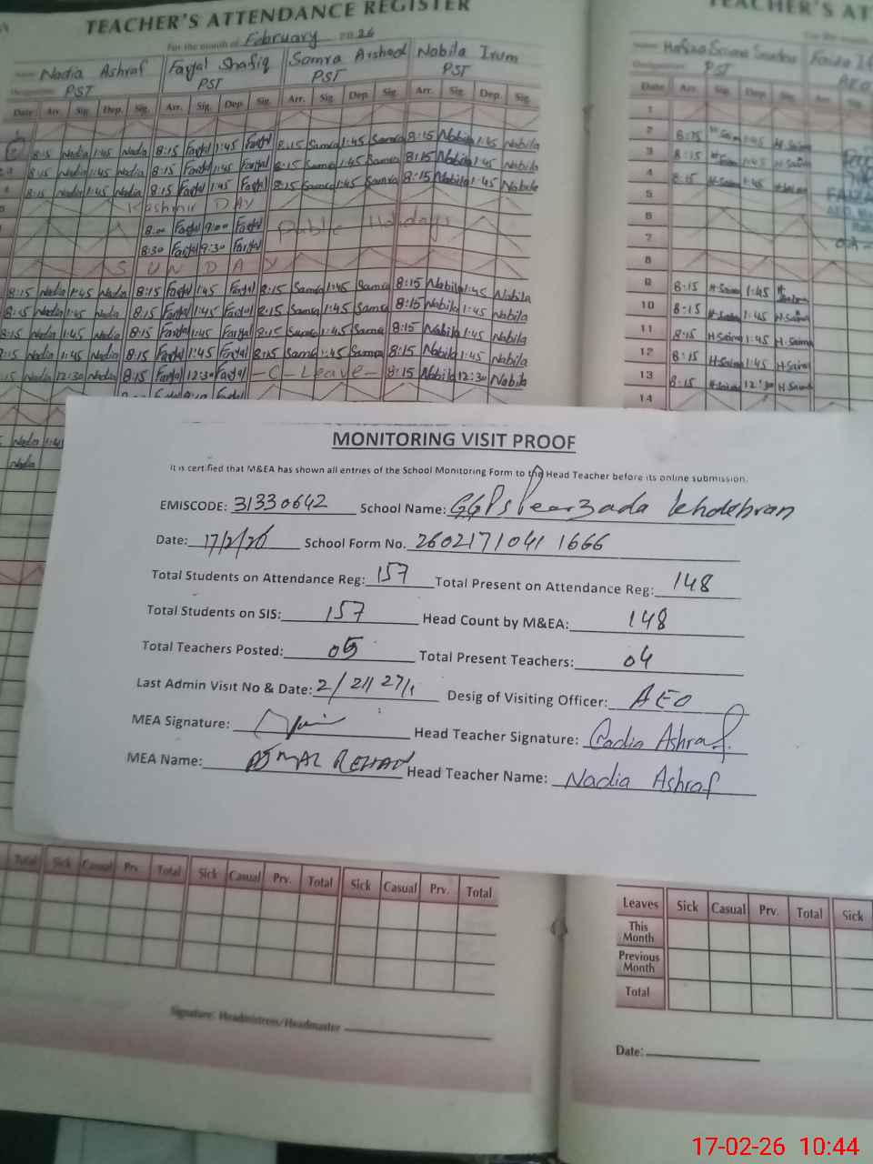 | Attendance Register | Head Teacher | MEA with School | Visit Proof |