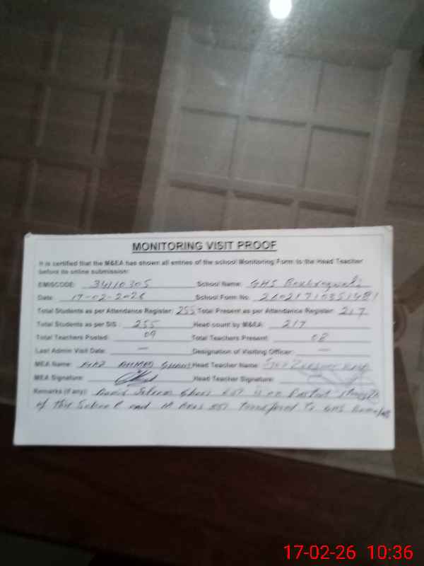 | Remarks (Use Separate Page if Required): Attendance of teaching staff and students on SIS Software is not updated Aamir Saleem Ghori EST is on the posted strength of this School but yet not updated on SIS Software Muhammad Anas SST Science has been transferred to GHS Bomabath after demotion NSB Record Register is not updated at the time of visit Data as per provided by School Staff and found during physical visit | |||||