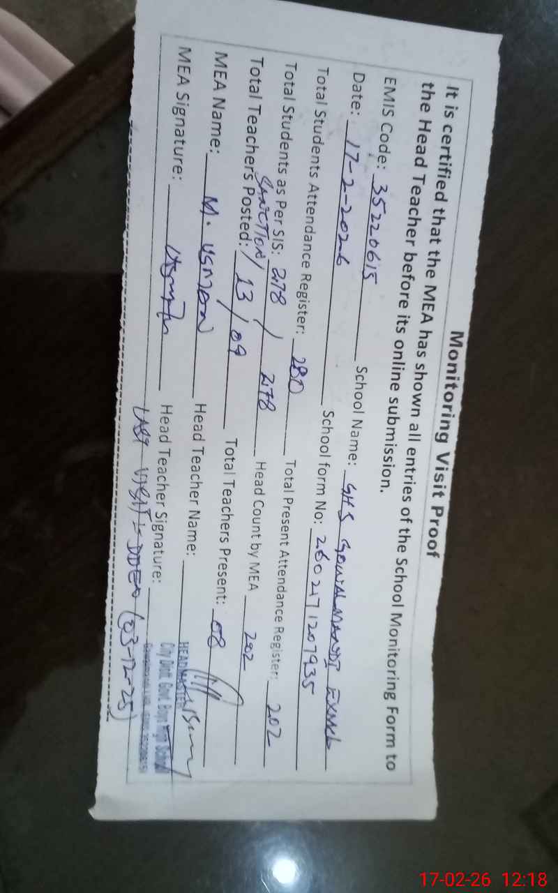| Certified that this School was Inspected by the Undersigned MEA/DMO Today and the Information Stated Above is as Per Record. | |||||