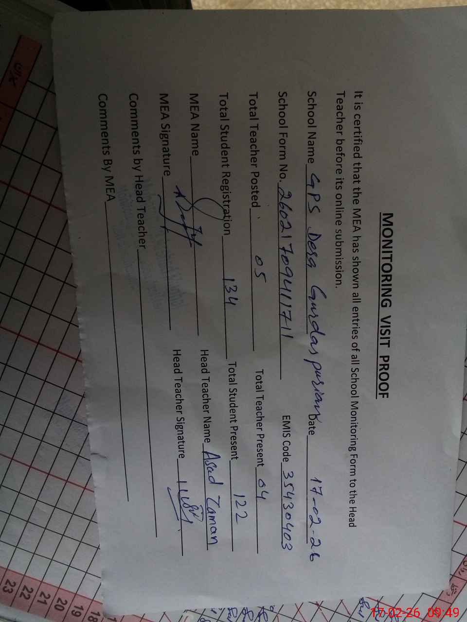 | Attendance Register | Head Teacher | MEA with School | Visit Proof |