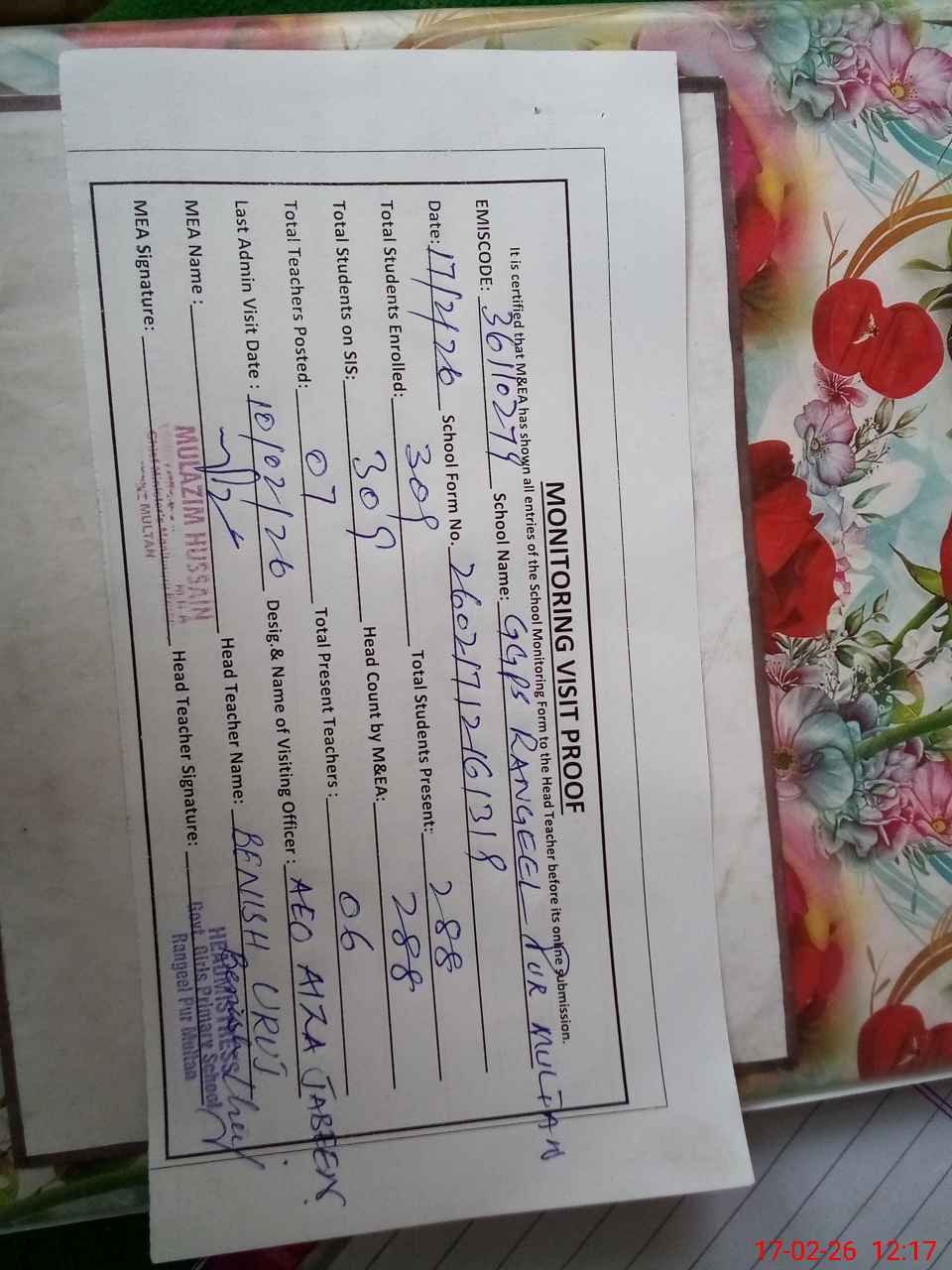 | Certified that this School was Inspected by the Undersigned MEA/DMO Today and the Information Stated Above is as Per Record. | |||||