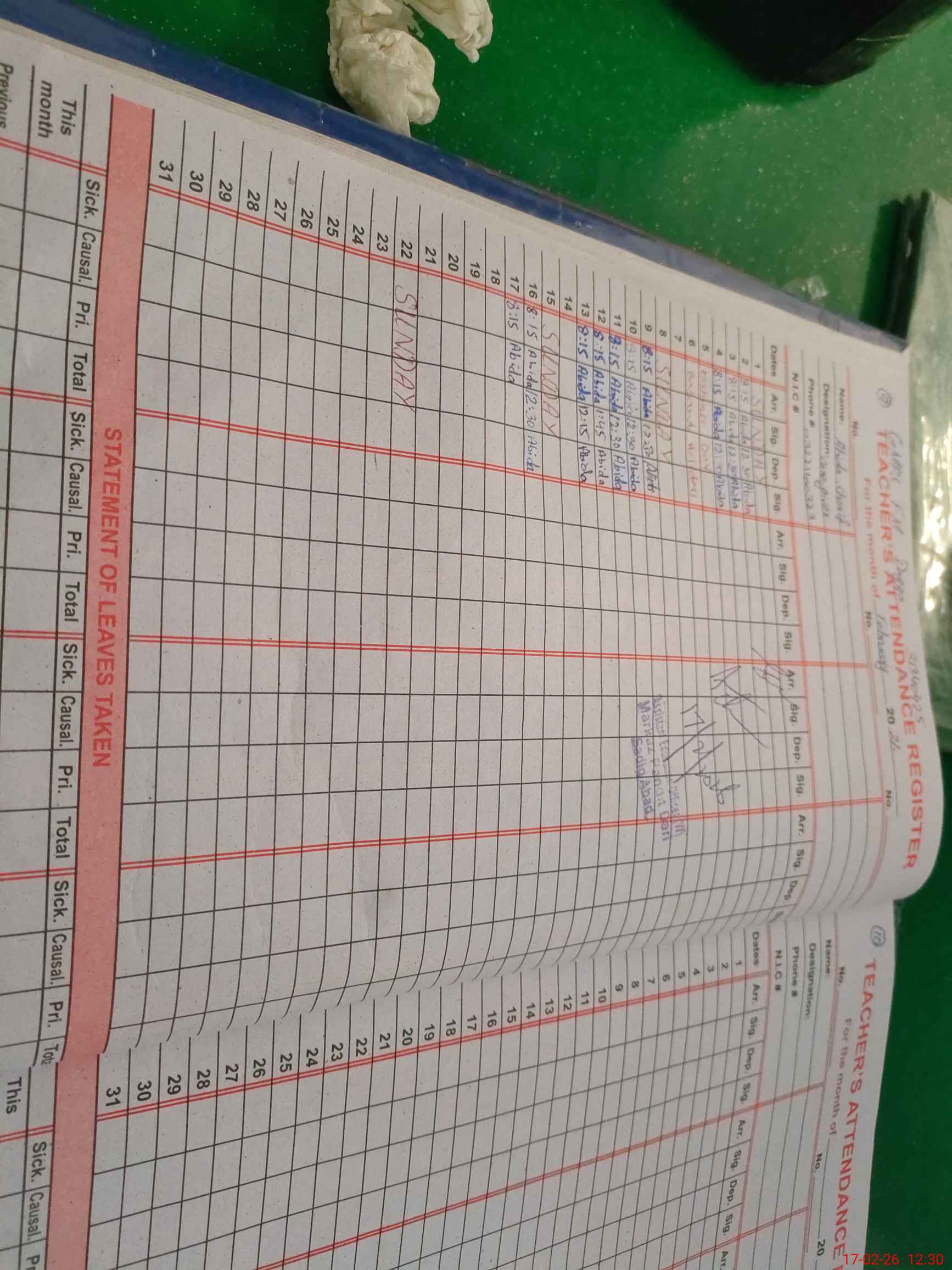 | CNIC | Full Name | Designation | R/C | Absence During Last Calender Month |