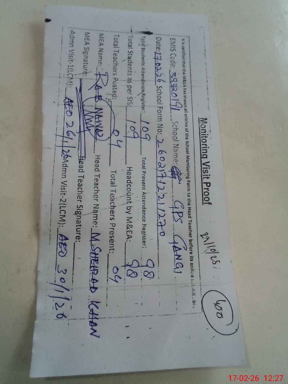 | Attendance Register | Head Teacher | MEA with School | Visit Proof |