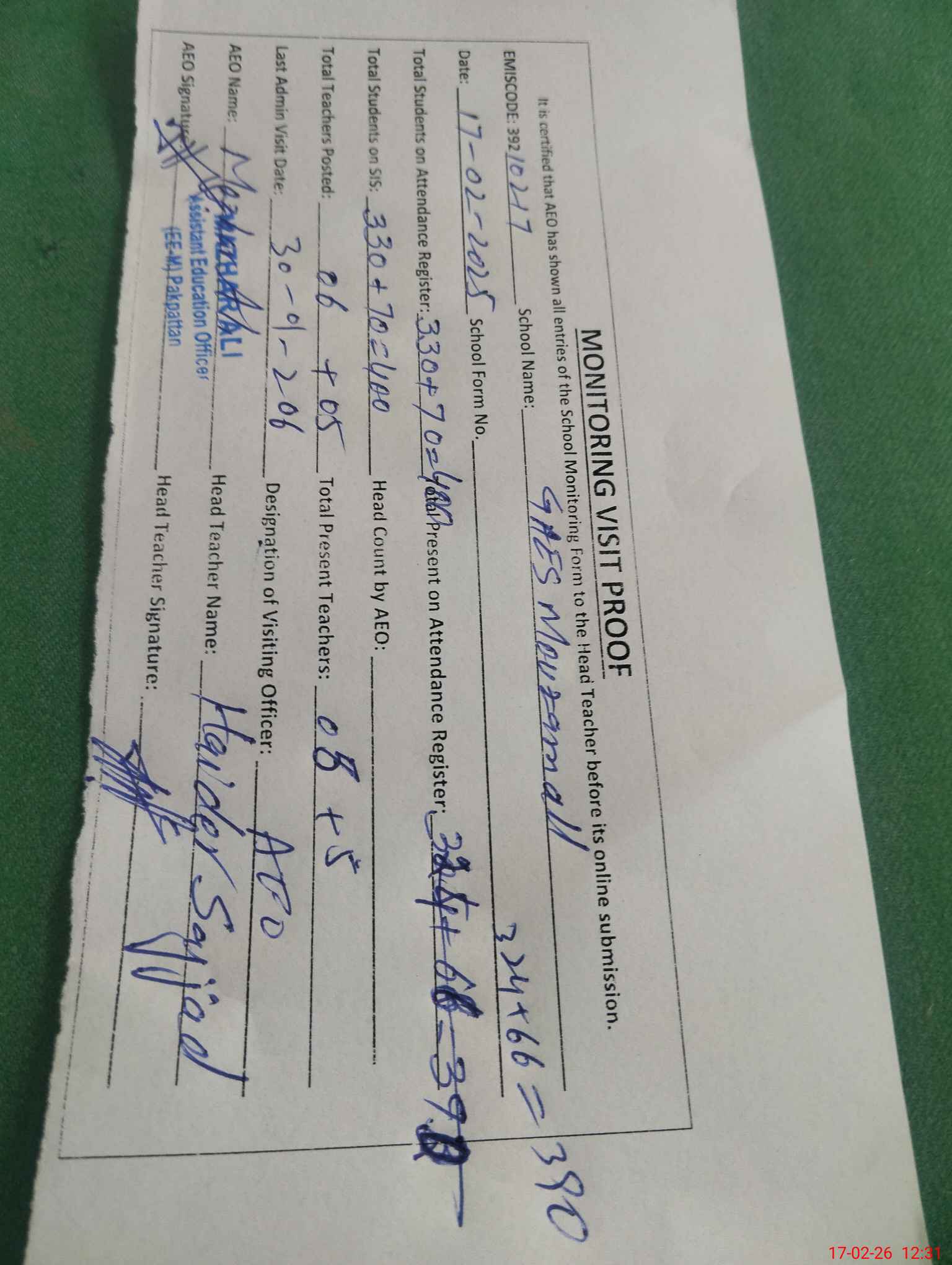 | Attendance Register | Head Teacher | MEA with School | Visit Proof |