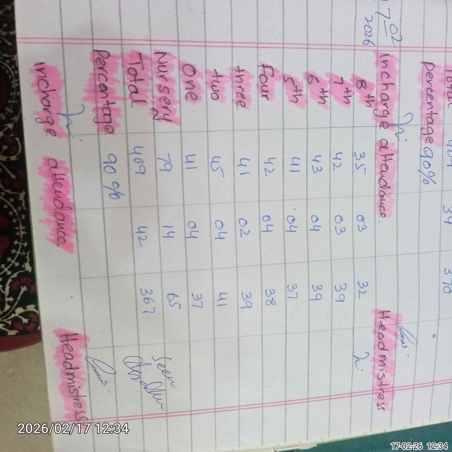 | No. of Students Present - Female | 0 | 0 | 37 | 41 | 39 | 38 | 37 | 39 | 39 | 32 | 367 | |||||