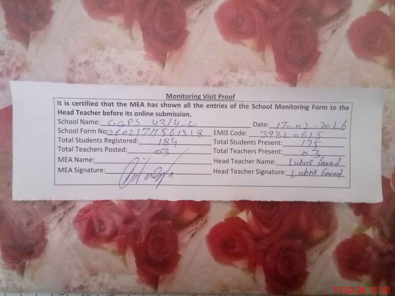 | Certified that this School was Inspected by the Undersigned MEA/DMO Today and the Information Stated Above is as Per Record. | |||||