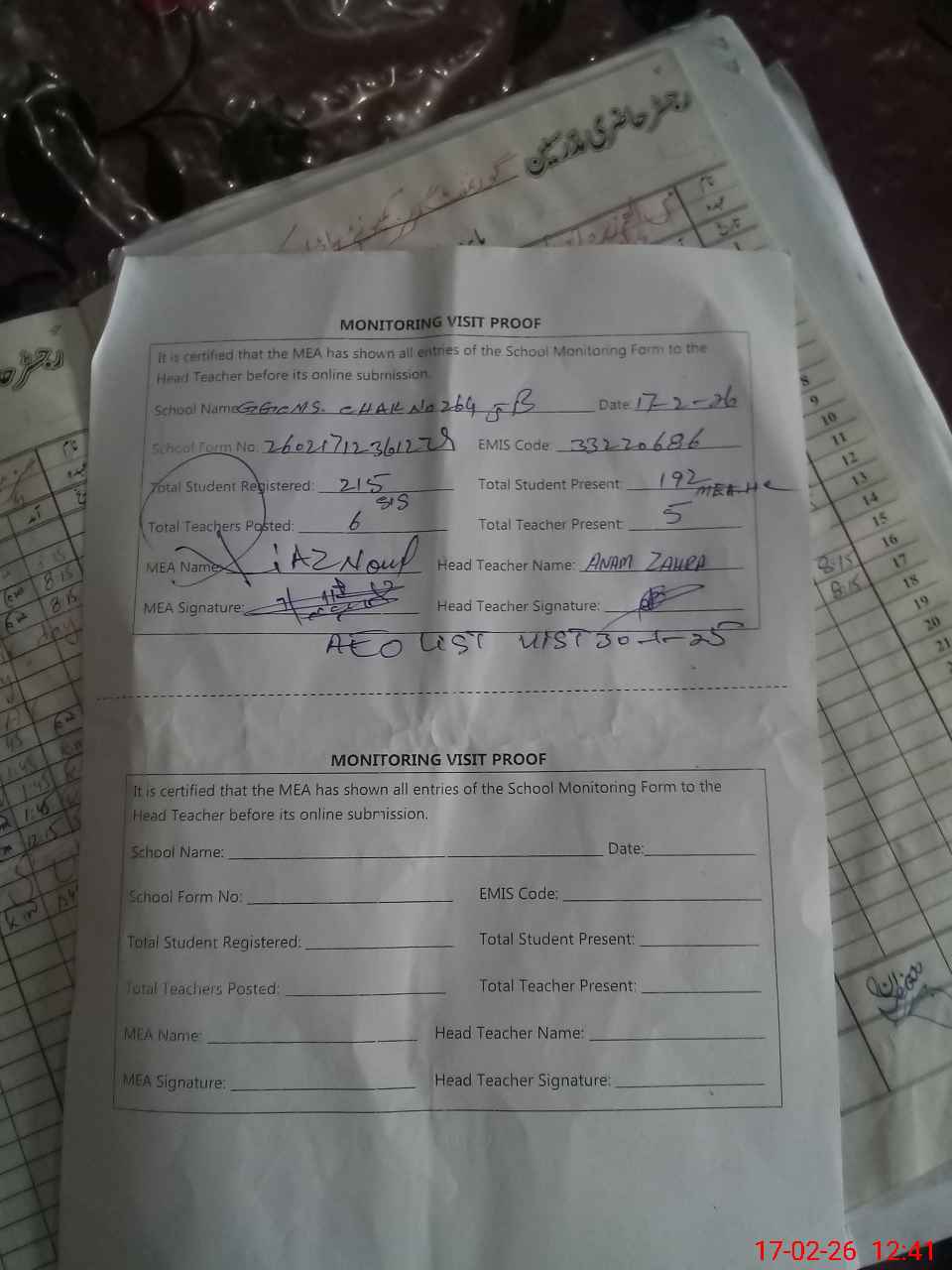 | Attendance Register | Head Teacher | MEA with School | Visit Proof |