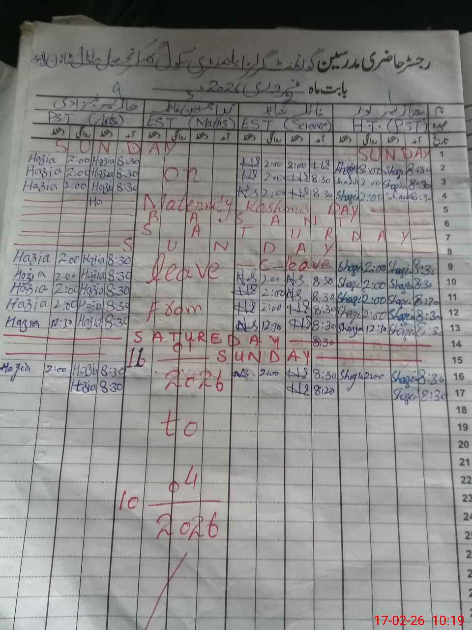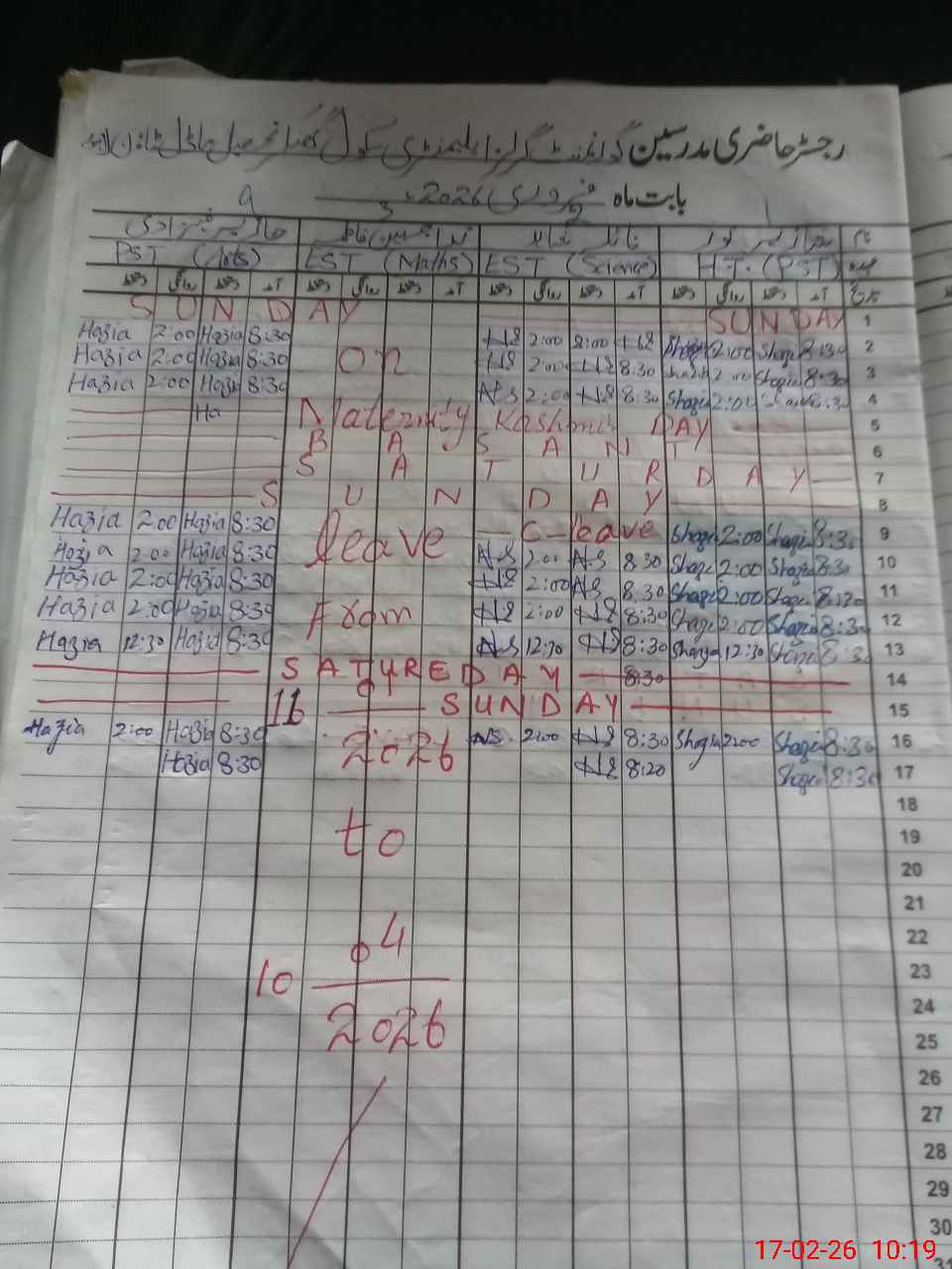 | CNIC | Full Name | Designation | R/C | Absence During Last Calender Month |