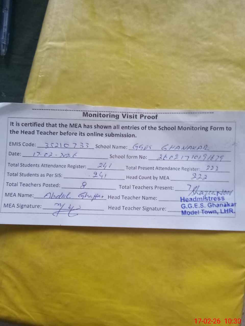 | Attendance Register | Head Teacher | MEA with School | Visit Proof |