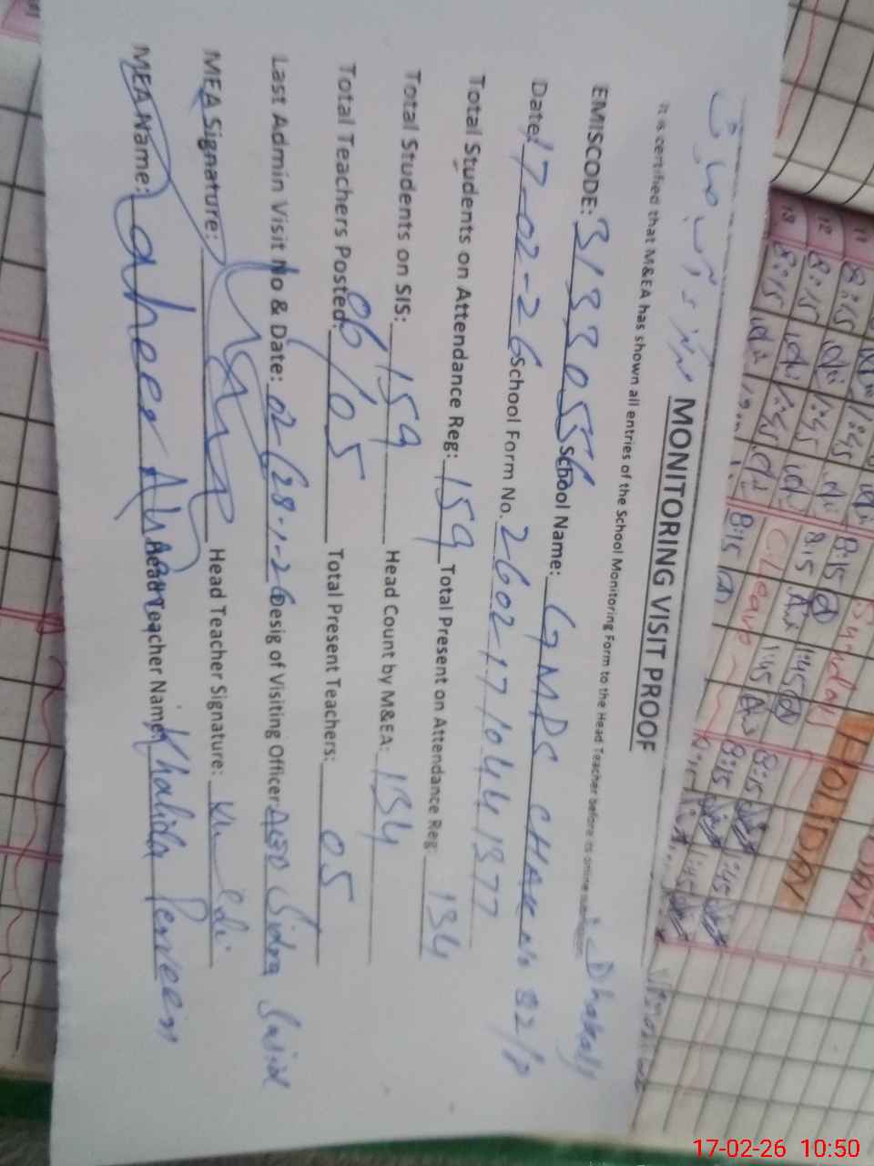 | Attendance Register | Head Teacher | MEA with School | Visit Proof |