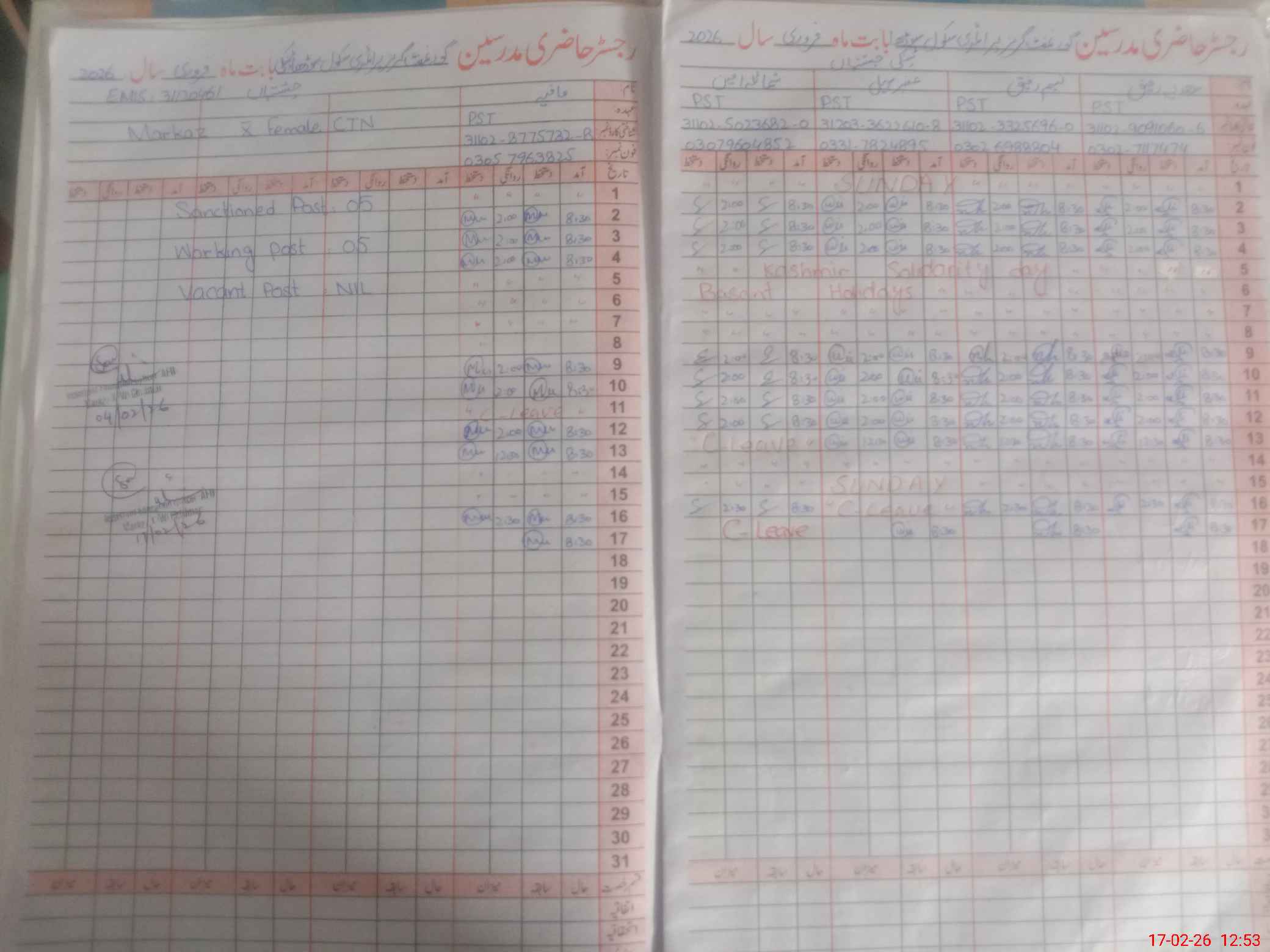 | CNIC | Full Name | Designation | R/C | Absence During Last Calender Month |