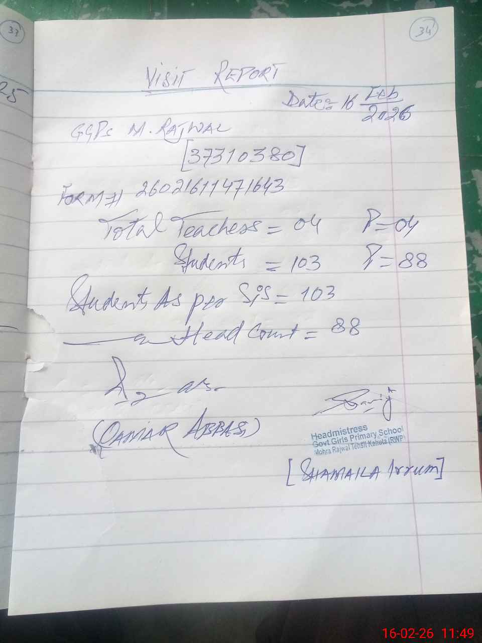 | Attendance Register | Head Teacher | MEA with School | Visit Proof |