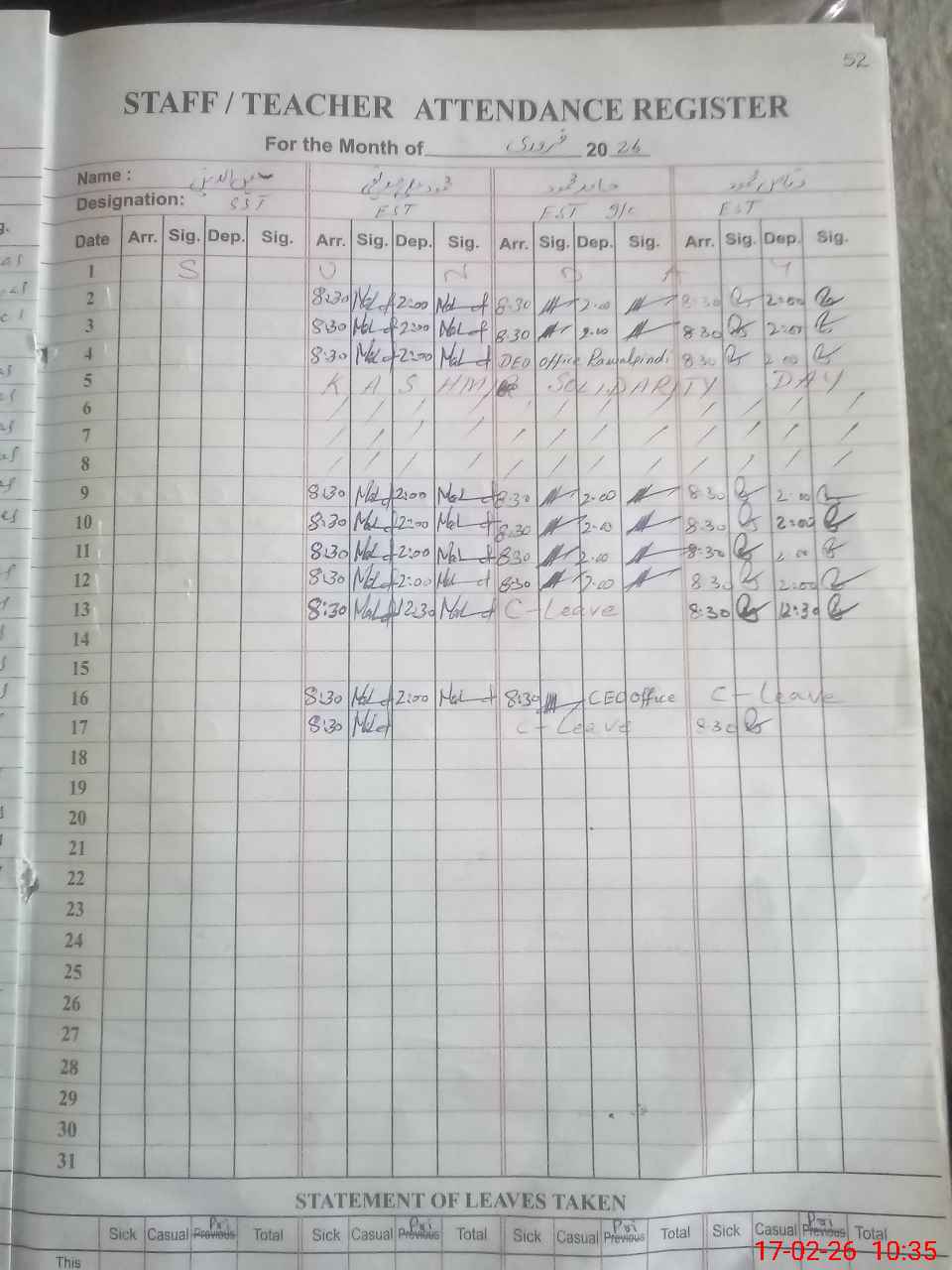 | 37**** | Af**** Ka**** | PST Science/Maths | Regular | 0 | 0 | 0 | 0 | 0 | 0 | 0 | 0 | 0 | Casual |
