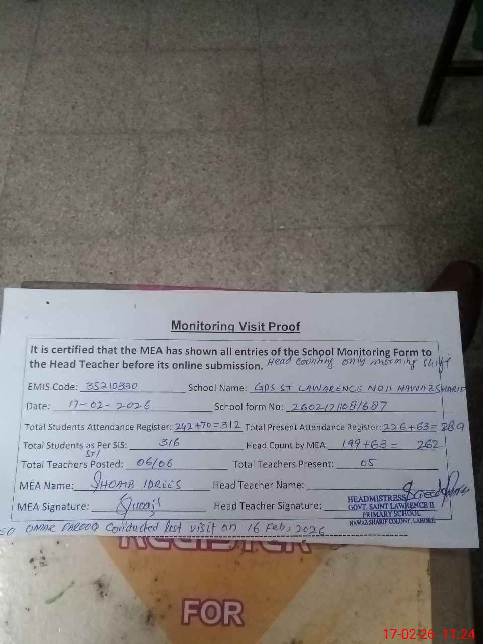 | EMIS Code: 35210330 | Name of School: GPS ST LAWARENCE NO II NAWAZ SHARIF COLONY | |||