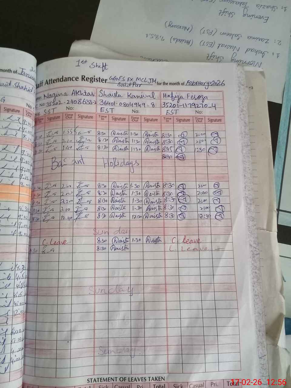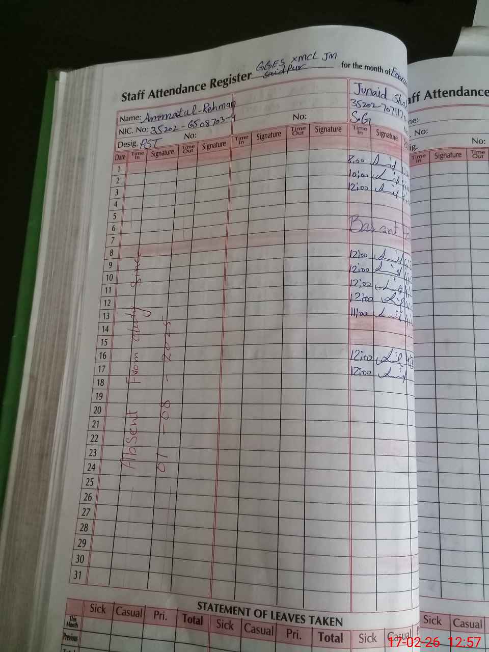 | CNIC | Full Name | Designation | R/C | Absence During Last Calender Month |