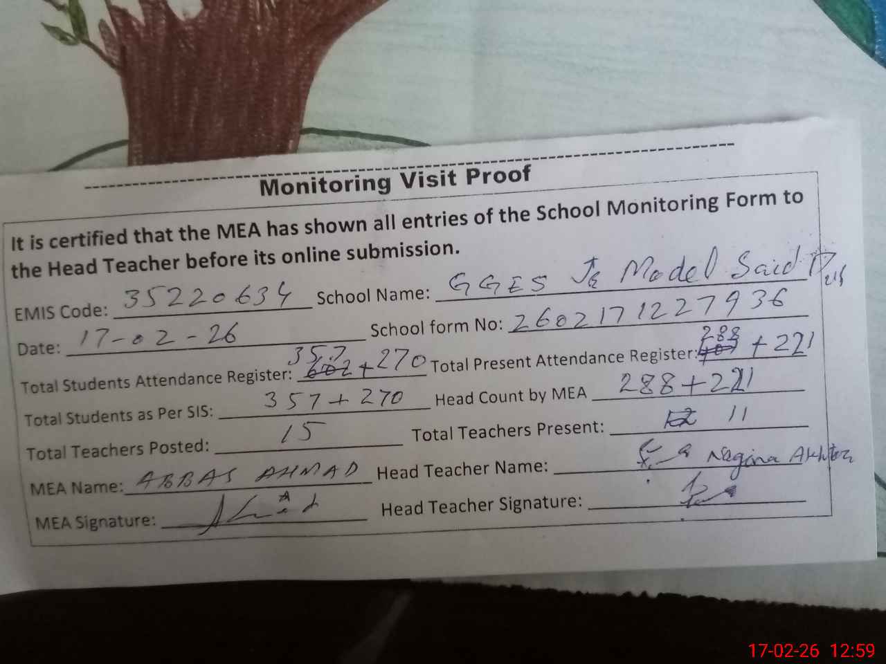 | Attendance Register | Head Teacher | MEA with School | Visit Proof |