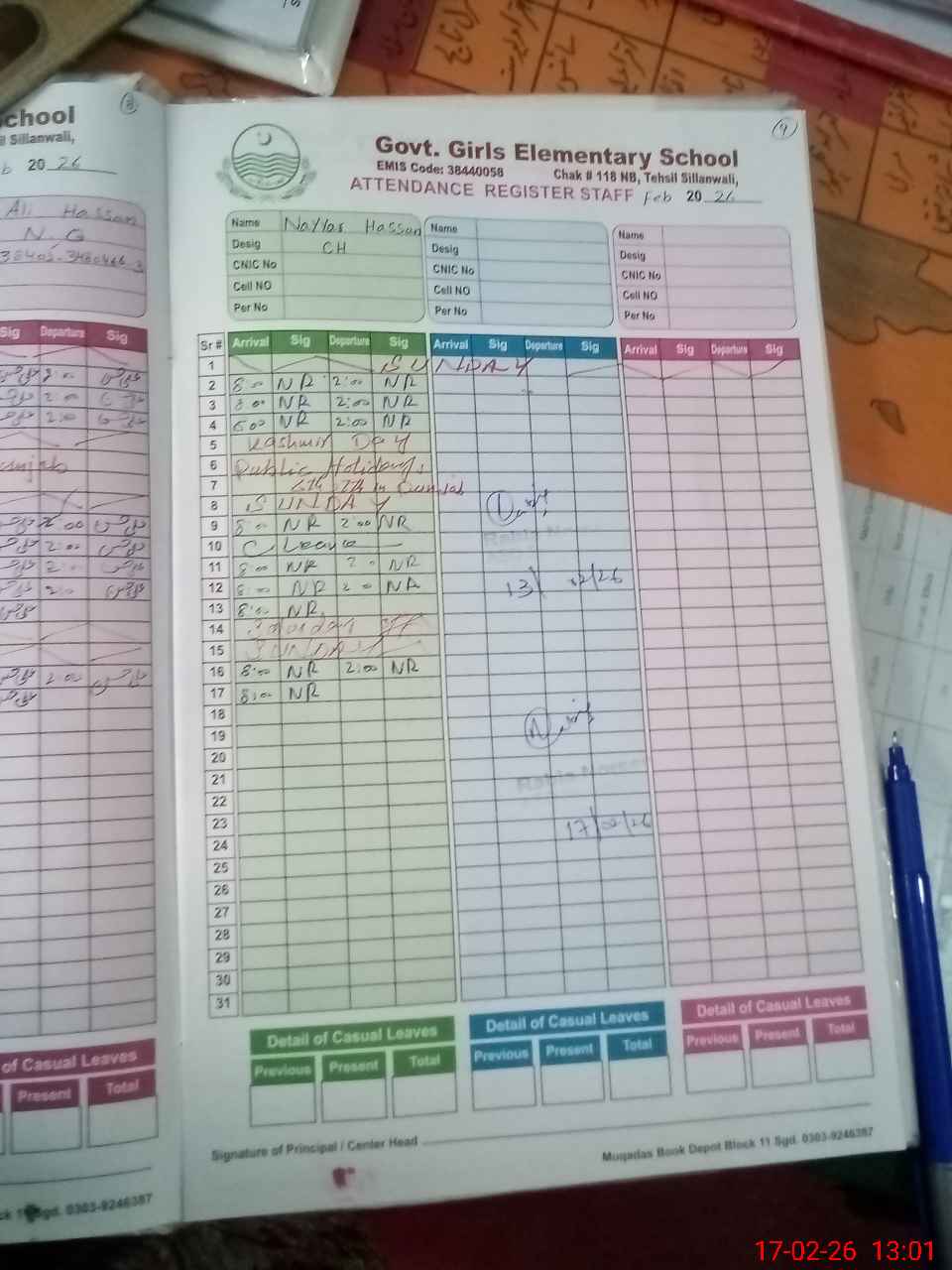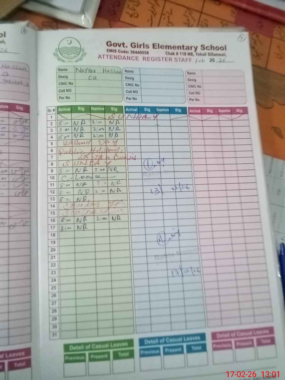 | CNIC | Full Name | Designation | R/C | Absence During Last Calender Month |