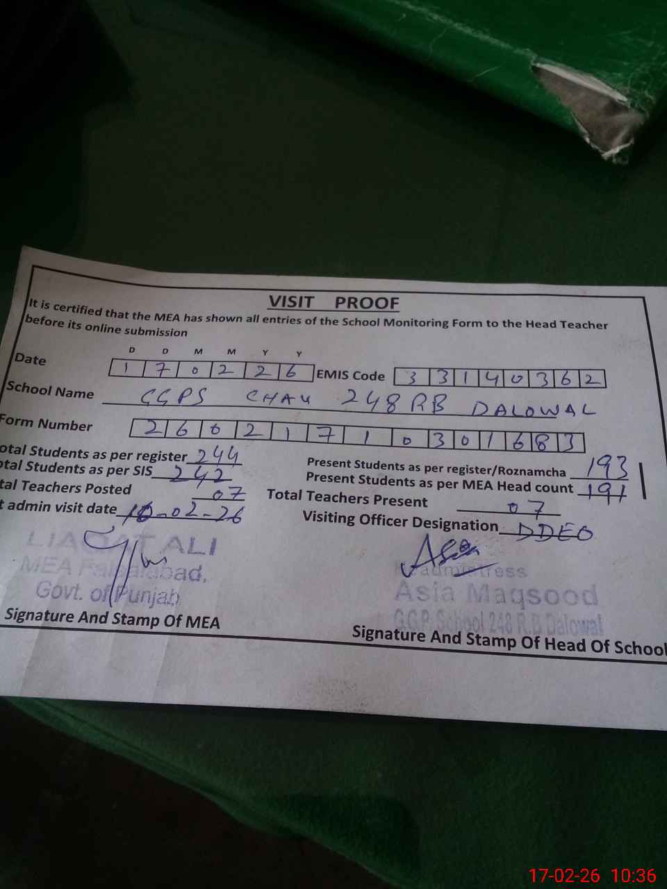 | Attendance Register | Head Teacher | MEA with School | Visit Proof |