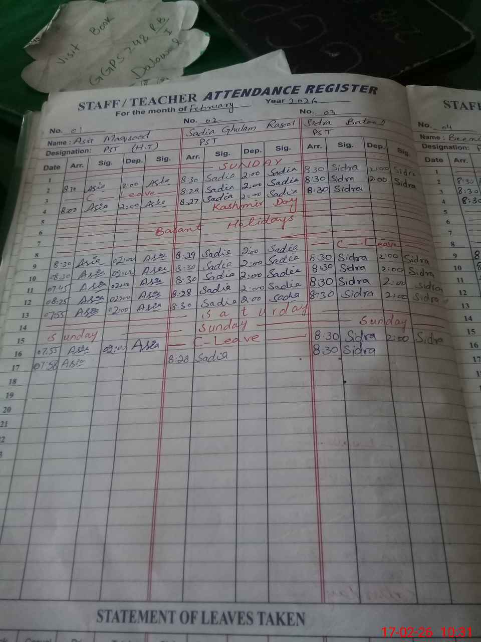 | Remarks (Use Separate Page if Required): NSB and FTF record maintained up to December 2025 also bank statement available up to December 2025. January 2026 record not shown also bank statement not available of January 2026 DDEO Memona Yaqoob visited school on 10 February 2026 | |||||