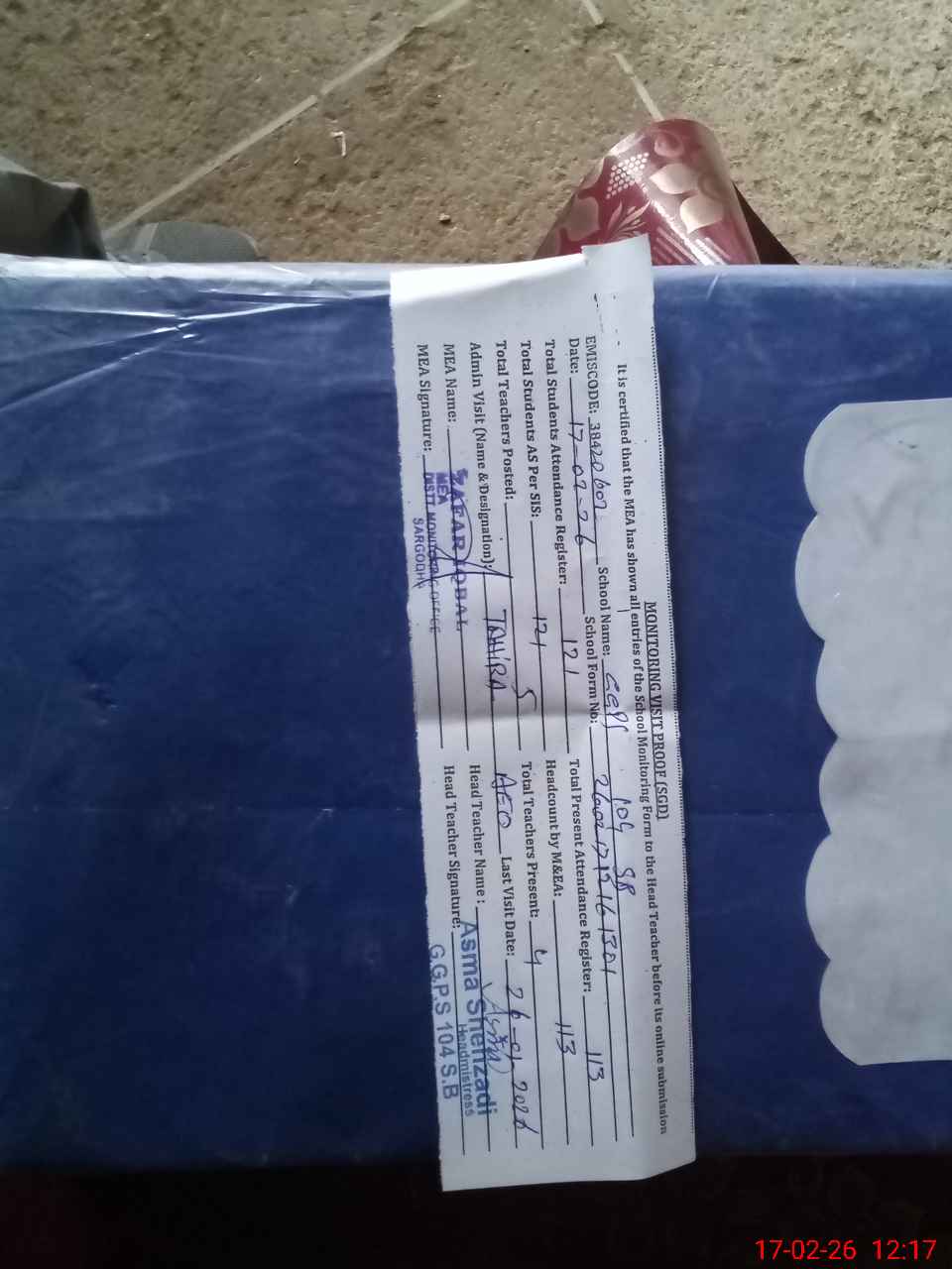 | Attendance Register | Head Teacher | MEA with School | Visit Proof |