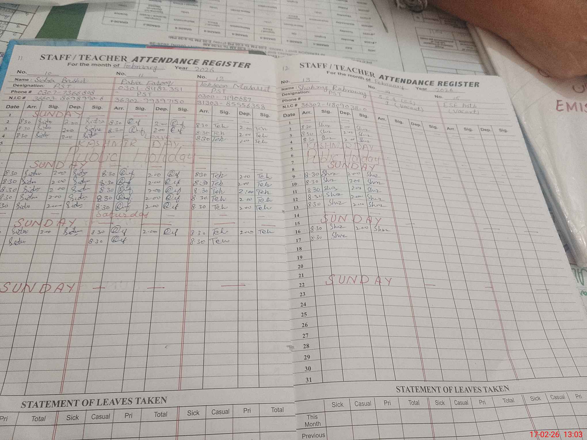 | CNIC | Full Name | Designation | R/C | Absence During Last Calender Month |
