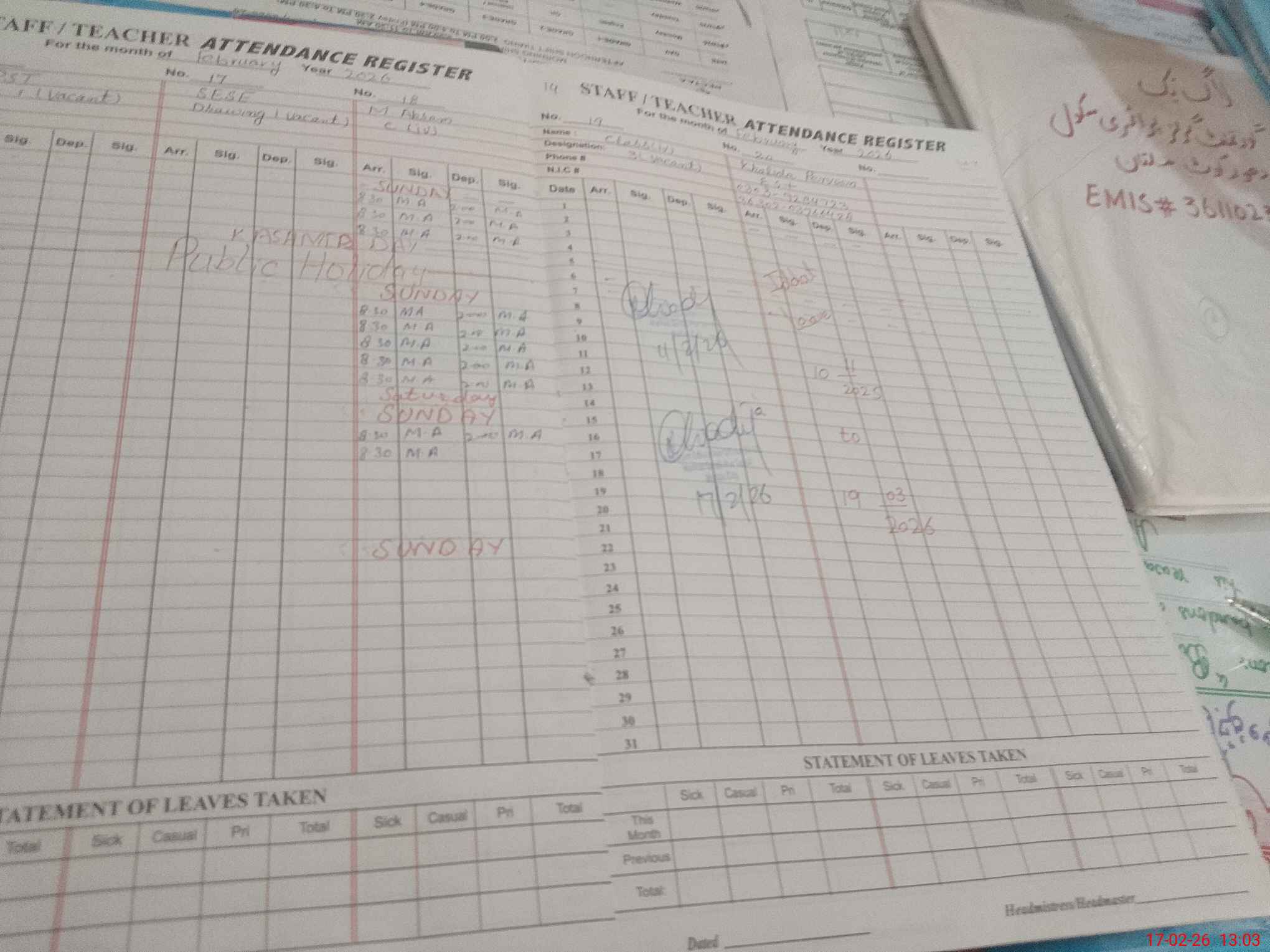 | Attendance Register | Head Teacher | MEA with School | Visit Proof |