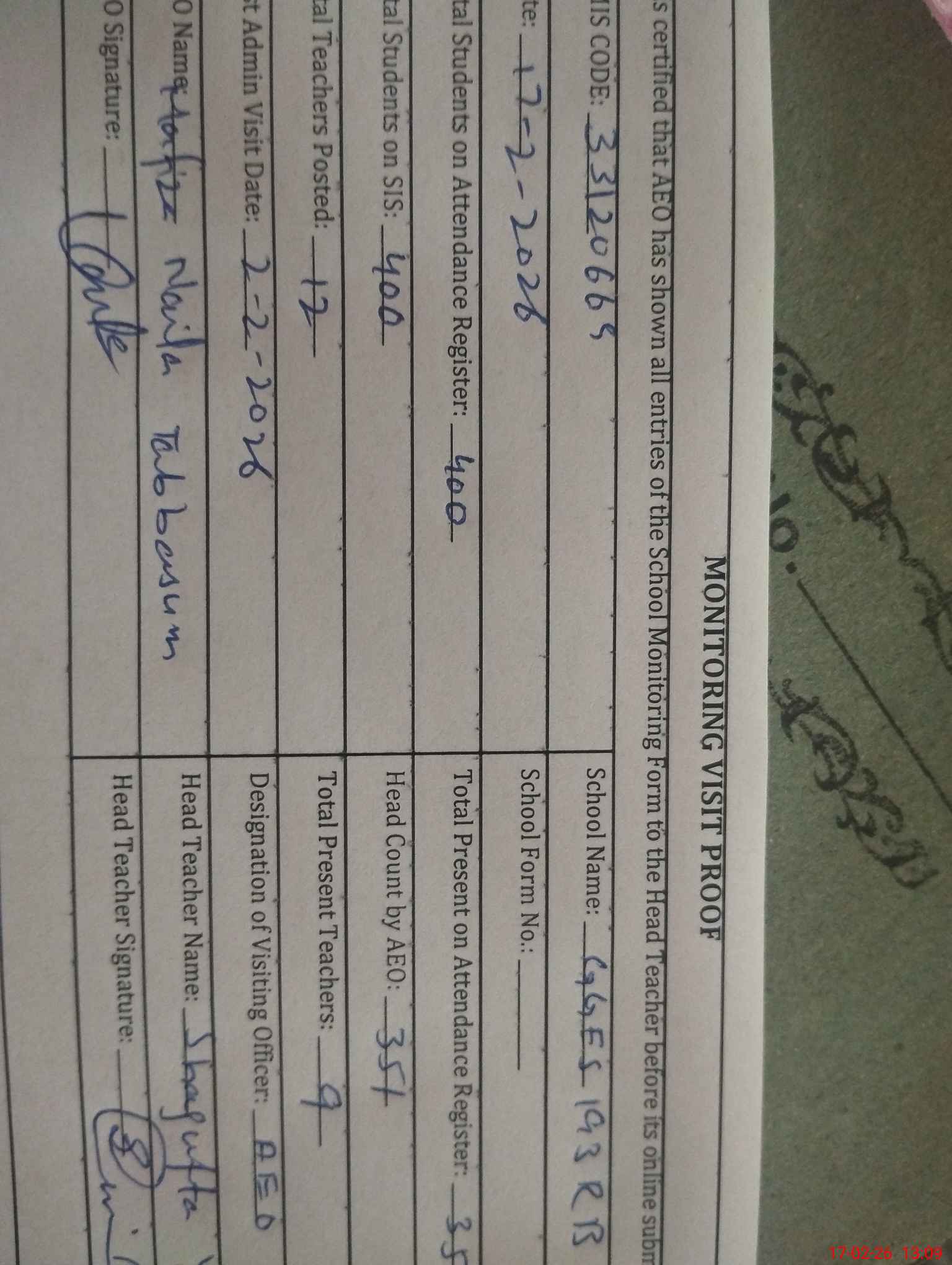 | Attendance Register | Head Teacher | MEA with School | Visit Proof |