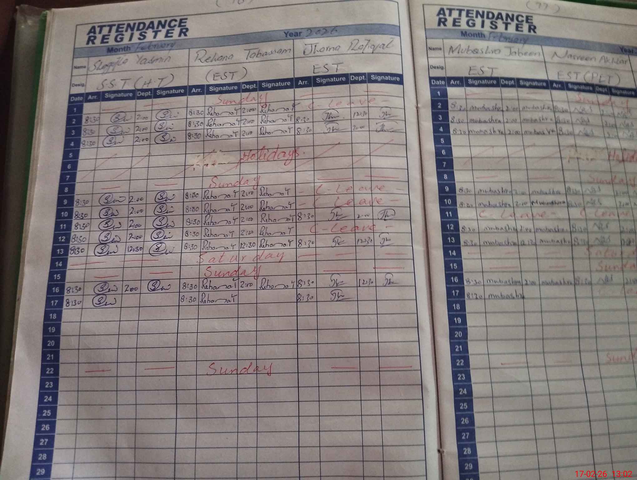 | CNIC | Full Name | Designation | R/C | Absence During Last Calender Month |