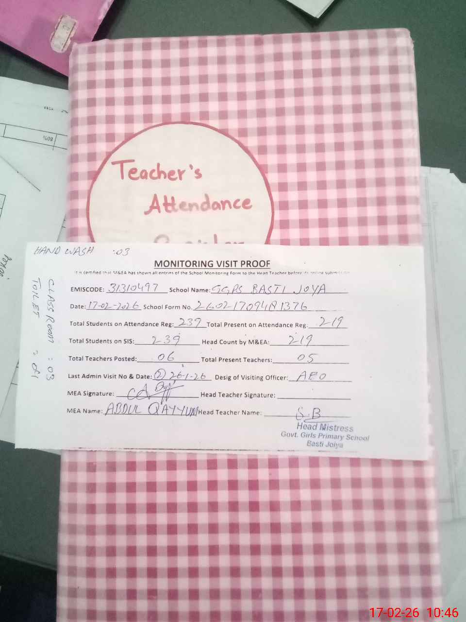 | Attendance Register | Head Teacher | MEA with School | Visit Proof |