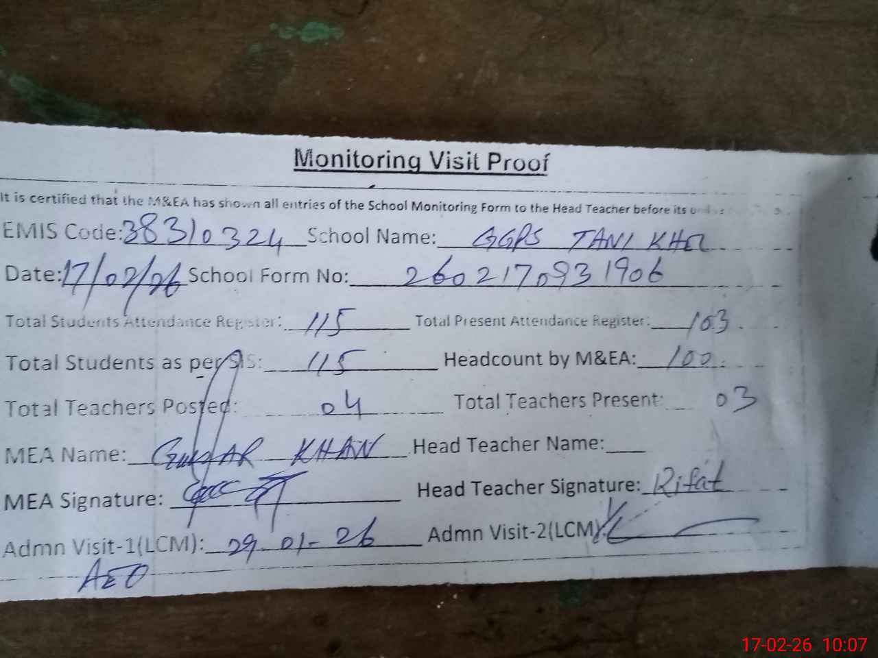 | EMIS Code: 38310324 | Name of School: GGPS TANI KHEL | |||