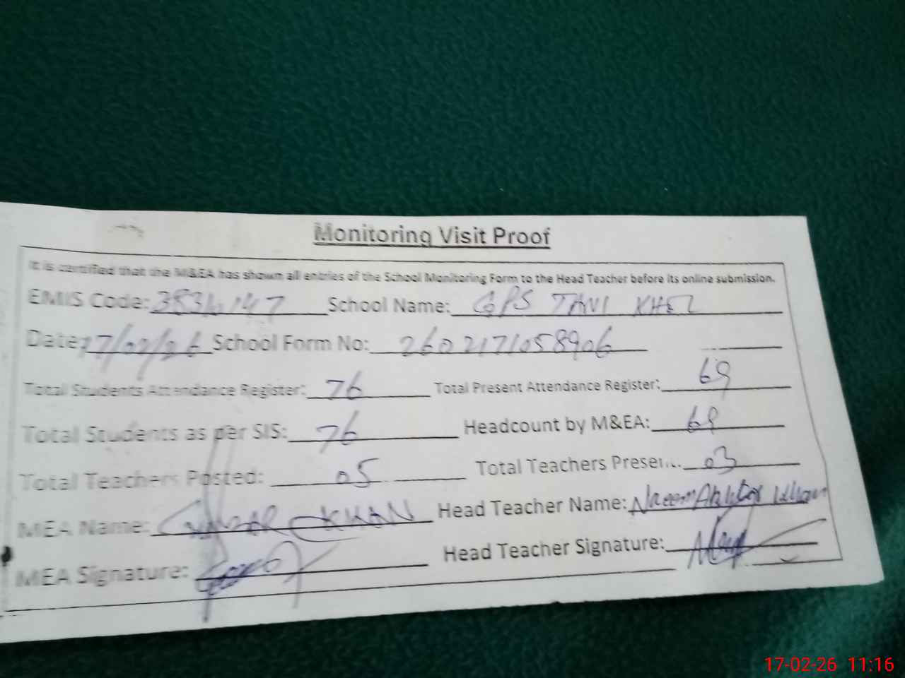 | Attendance Register | Head Teacher | MEA with School | Visit Proof |