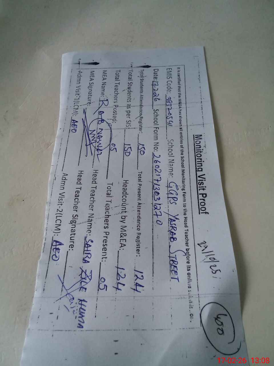 | Attendance Register | Head Teacher | MEA with School | Visit Proof |