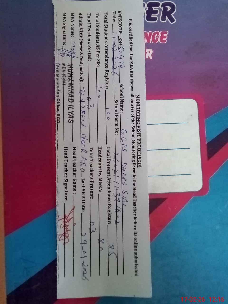 | EMIS Code: 38450474 | Name of School: GGPS DHERO SAIL | |||