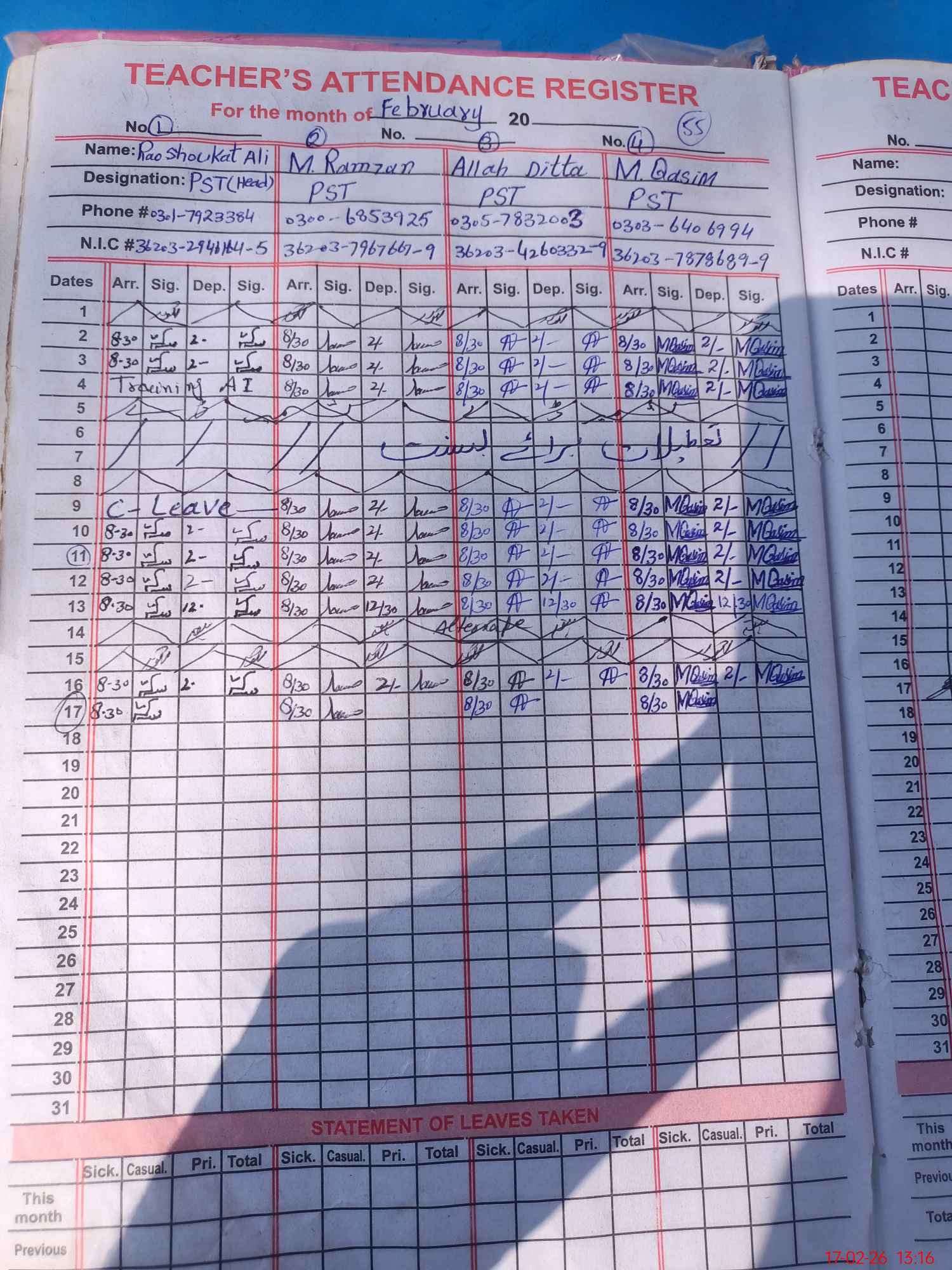 | CNIC | Full Name | Designation | R/C | Absence during last cal. month |