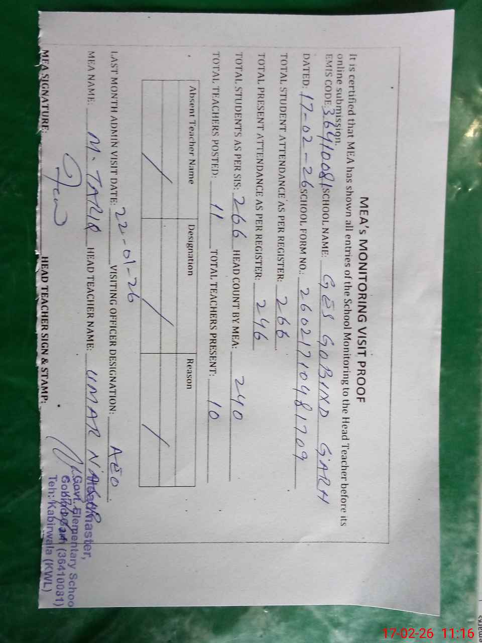 | EMIS Code: 36410081 | Name of School: GES GOBIND GARH, ABDUL HAKIM | |||