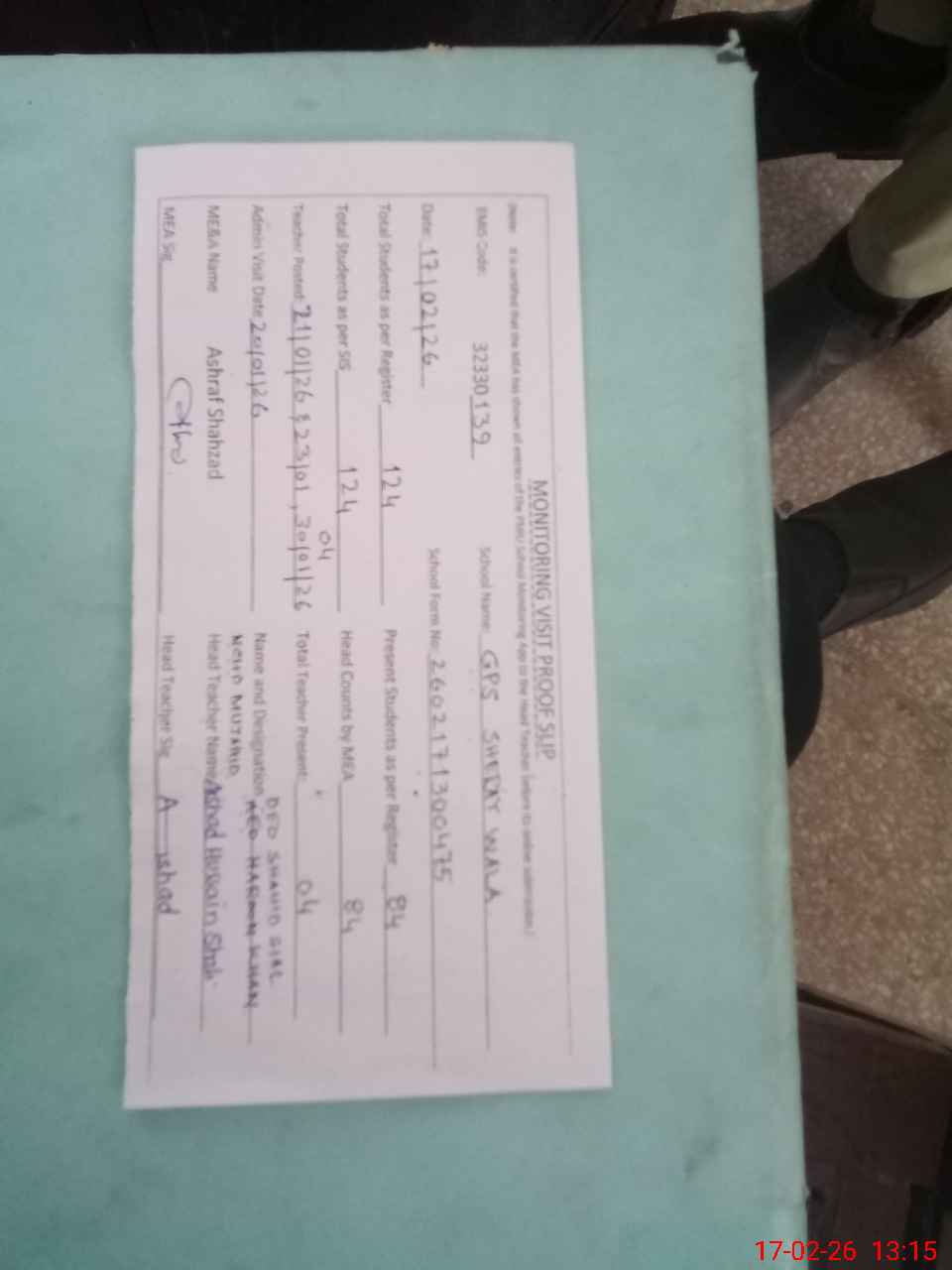 | Attendance Register | Head Teacher | MEA with School | Visit Proof |