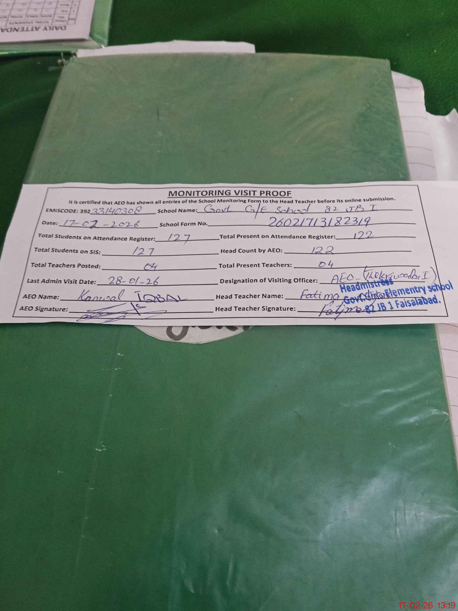 | EMIS Code: 33140308 | Name of School: GGES CHAK NO 82 JB I | |||