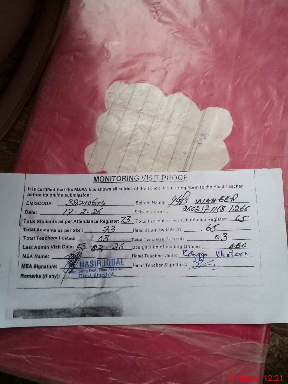 | Attendance Register | Head Teacher | MEA with School | Visit Proof |