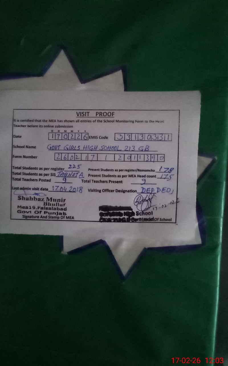 | EMIS Code: 33130331 | Name of School: GGHS CHAK NO. 213/GB | |||