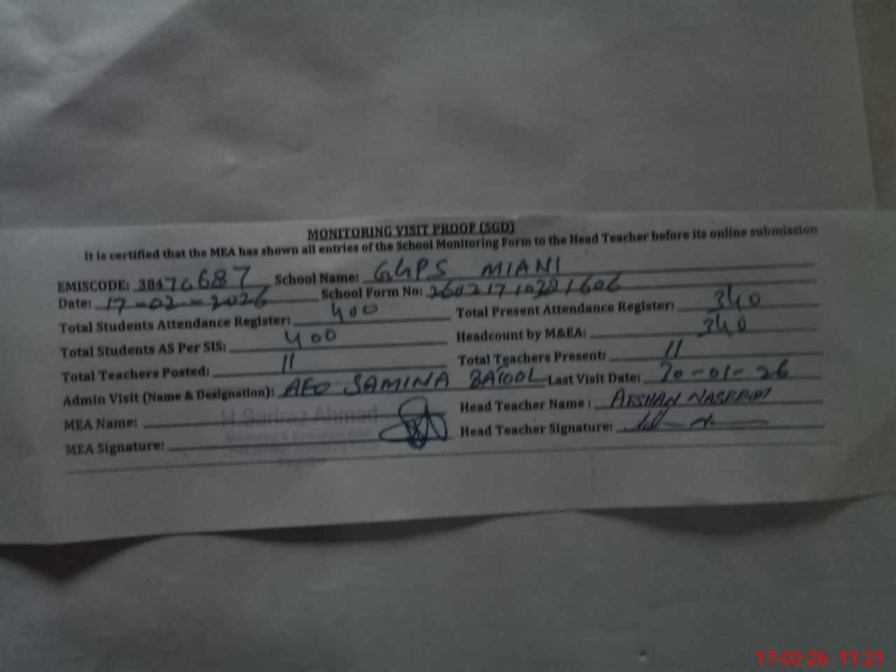 | Attendance Register | Head Teacher | MEA with School | Visit Proof |